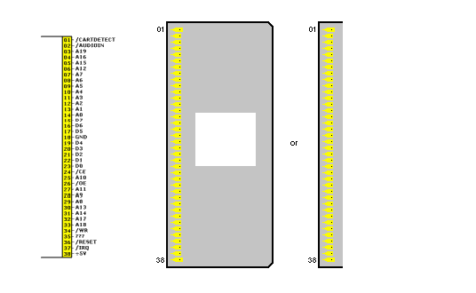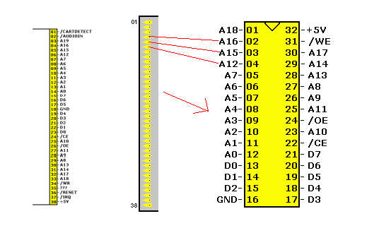 Connect board connector legs with EPROM/FLASH DIP socket (or directly to eprom legs). You can use 1MByte 27C080/27C801 EPROMS (PCE connector have pin with address A19).